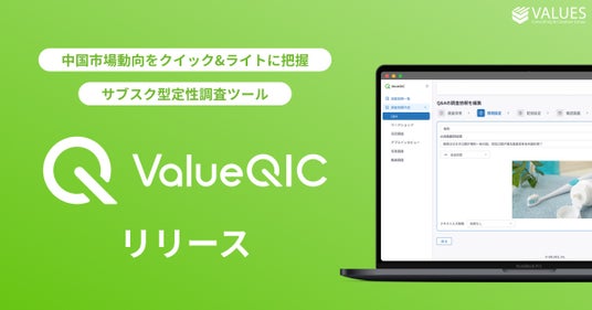 インターネット行動ログ分析によるマーケティング調査・コンサルティングサービスを提供する株式会社ヴァリューズ(本社:東京都港区、代表取締役社長:辻本 秀幸、以下「ヴァリューズ」)は、中国市場動向をクイック&ライトに把握できるサブスク型定性調査ツール「ValueQIC」(ヴァリュークイック)をリリースしました。いつでも必要な時にWeb上で、最短1週間で中国市場トレンドの調査が可能です。