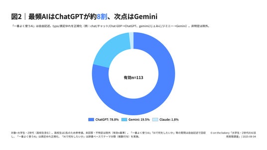 - 最もよく使うAI(正規化):ChatGPT 78.8%(89/113)、Gemini 19.5%、Claude 1.8%