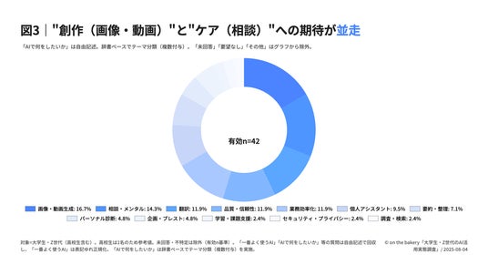 - 「AIで何をしたいか」(要望カテゴリのみ・有効n=42):画像・動画生成 16.7%、相談・メンタル 14.3%、翻訳・品質/根拠・業務効率化 各11.9%