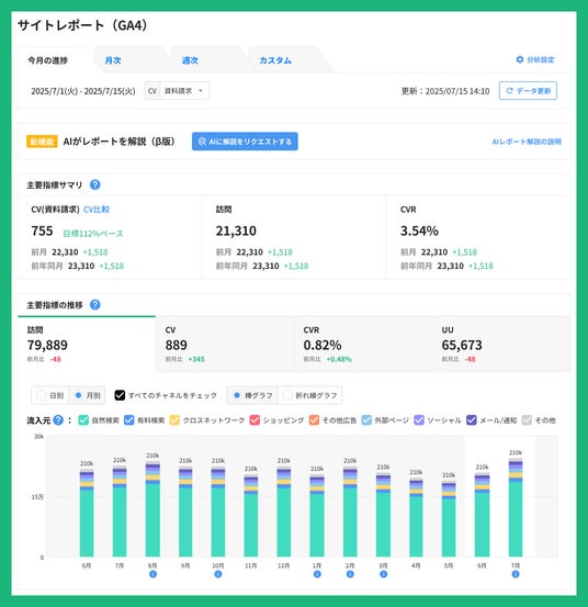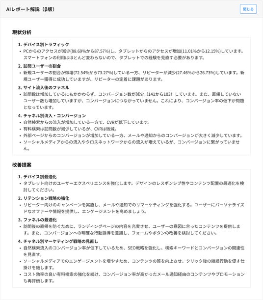 本機能は、サイトレポートに含まれる数値データをもとに、生成AIが現状のまとめと改善提案を提示します。また、単月の情報にとどまらず、前月データとの比較を含めた考察を加えることで、数値の変化に対する背景や意図を理解しやすくなっています。