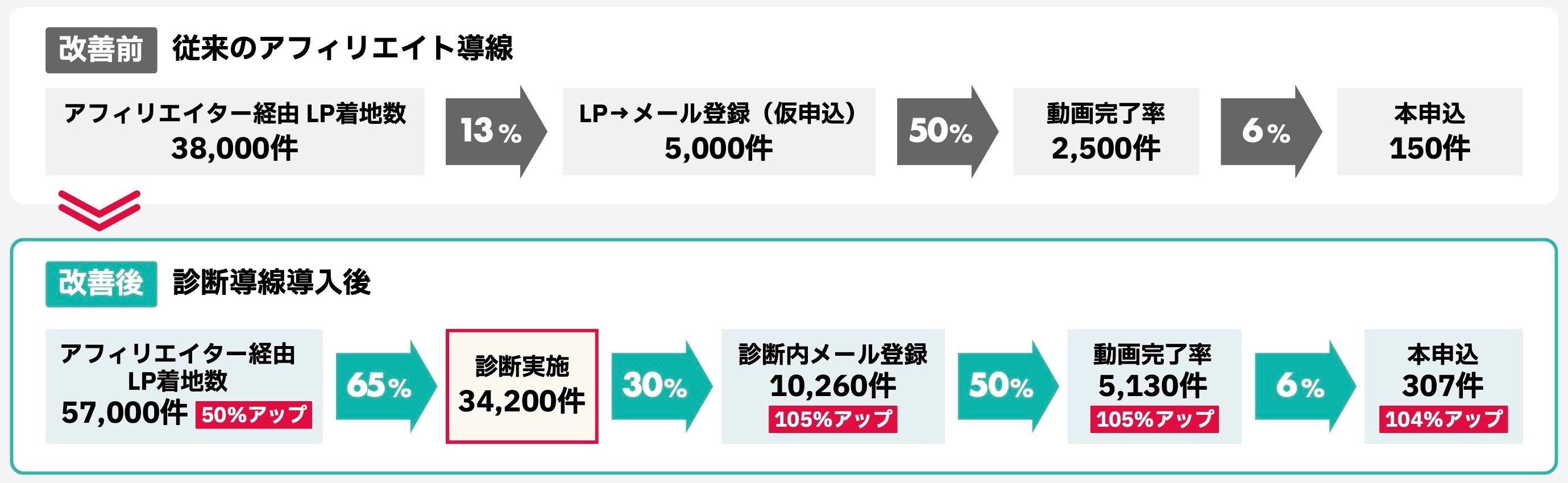 従来のアフィリエイト導線と比較して、大幅な成果向上を実現しています。診断コンテンツの導入により、ユーザーの関心度と理解度が飛躍的に向上し、各段階での離脱率が大幅に改善されました。