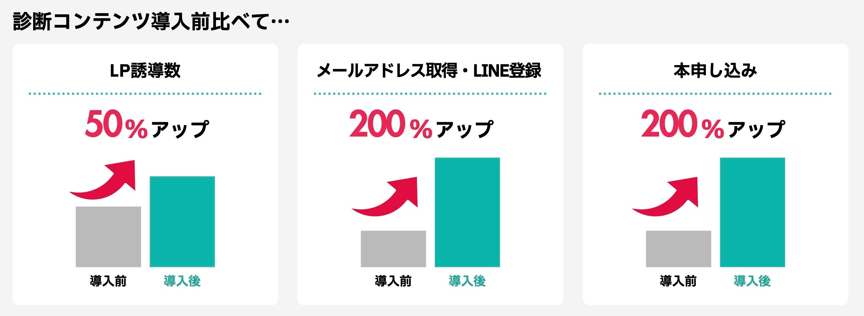 従来のアフィリエイト導線では成約率1%以下も珍しくない中、診断コンテンツを起点とした新手法により、投資商材での実証では成約率が205%向上、メールアドレス取得率も金融サービスで約4倍、教育・スキルアップで約2.4倍の改善を実現しています。