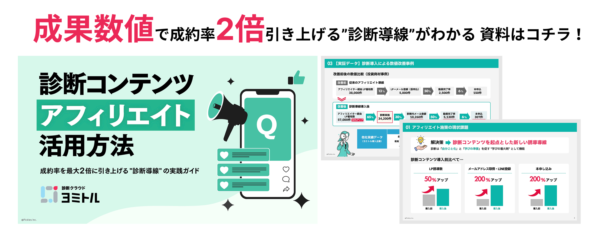 診断コンテンツ アフィリエイト活用方法「成約率を最大2倍に引き上げる"診断導線"の実践ガイド」 は、以下のリンクより無料でダウンロード可能です。実証データをもとに改善前後の具体的数値比較など数値でマルっとわかる資料です。