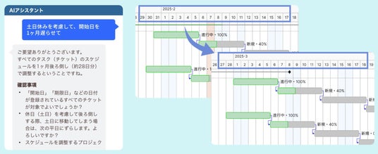 ガントチャート全体のスケジュールをAIが一括で調整。「開始日を1週間延ばして」といった指示にも自然な対話で対応します。