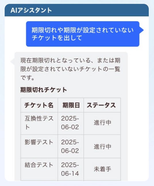 確認したい条件を伝えるだけで、必要なチケットを即座に表示します。「〇〇に関連するチケットを探して」「開始日が近い担当者未設定のチケットを教えて」と伝えるだけで、今まではできなかったチケットの題名、説明、コメントの横断検索や絞り込みができるようになりました。