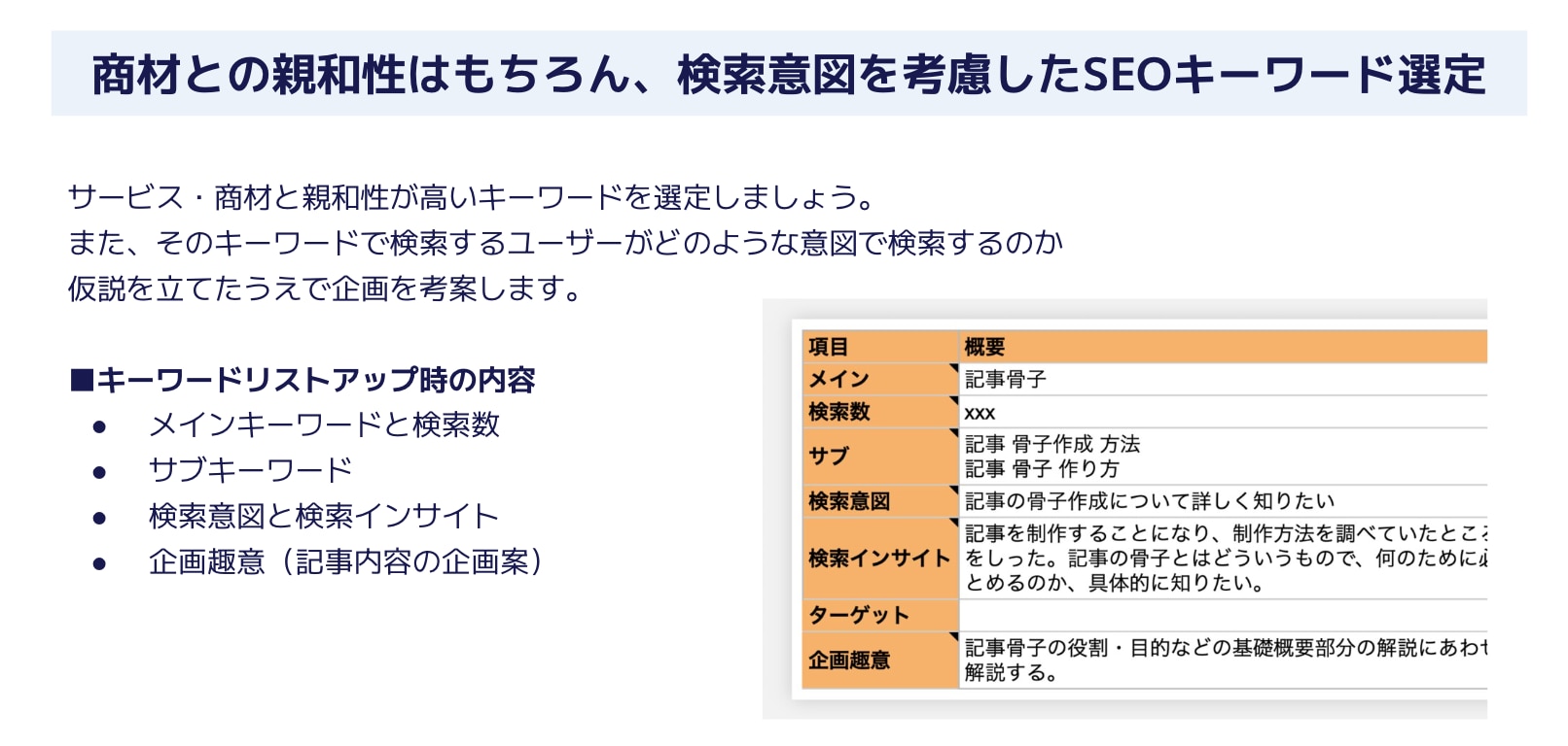 単に検索ボリュームを追うのではなく、「成約に近い顕在層」が検索するキーワードを優先します。「〇〇 比較」「〇〇 事例」といった、具体的な解決策を求めているキーワードが中心です。 キーワードの妥当性を高めるには、営業現場やインサイドセールス(IS)へのヒアリングが不可欠です。顧客が実際に商談で口にする悩みや、意思決定の際に検索する言葉を収集し、キーワード選定に反映させましょう。