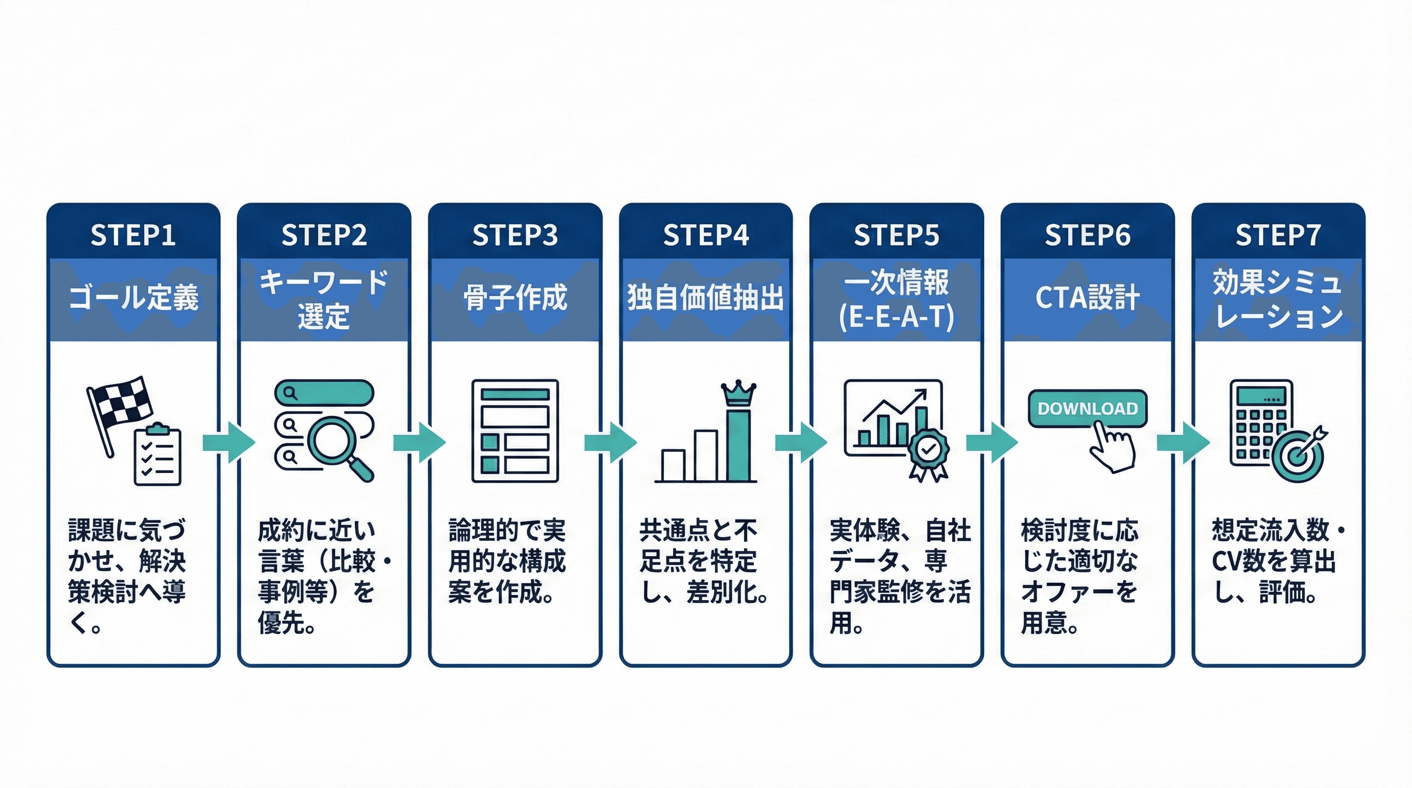 まずは、本稿で解説した「企画・設計の7ステップ」に基づき、既存記事の棚卸しから始めてみてください。「どの記事が、どの検討フェーズの読者を、どう動かすのか(態度変容)」を再定義し、CVに近いキーワードから優先的に着手することが、最短で成果を出す定石です。