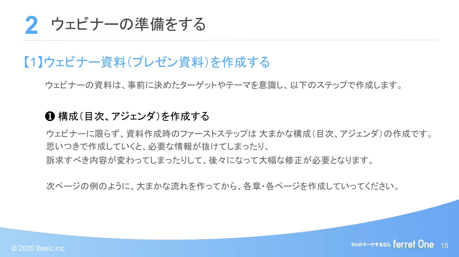 まずはスライド等のウェビナー資料を作成しましょう。大きな流れを把握するために構成を作成してから作業に取り掛かることをおすすめします。
