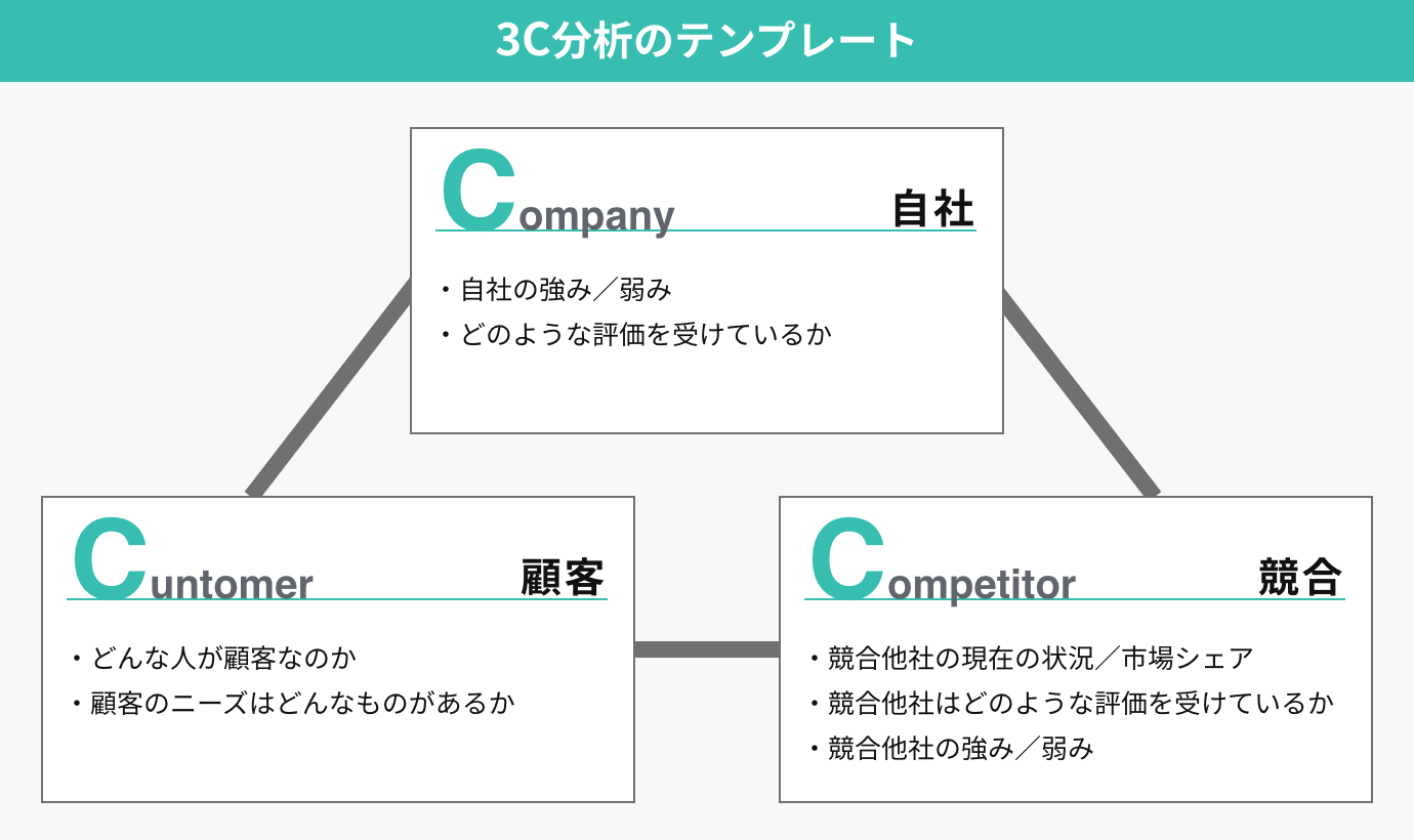3Cは、Customer(市場・顧客)、Company(自社)、Competitor(競合) の、3つの「C」を表しています。