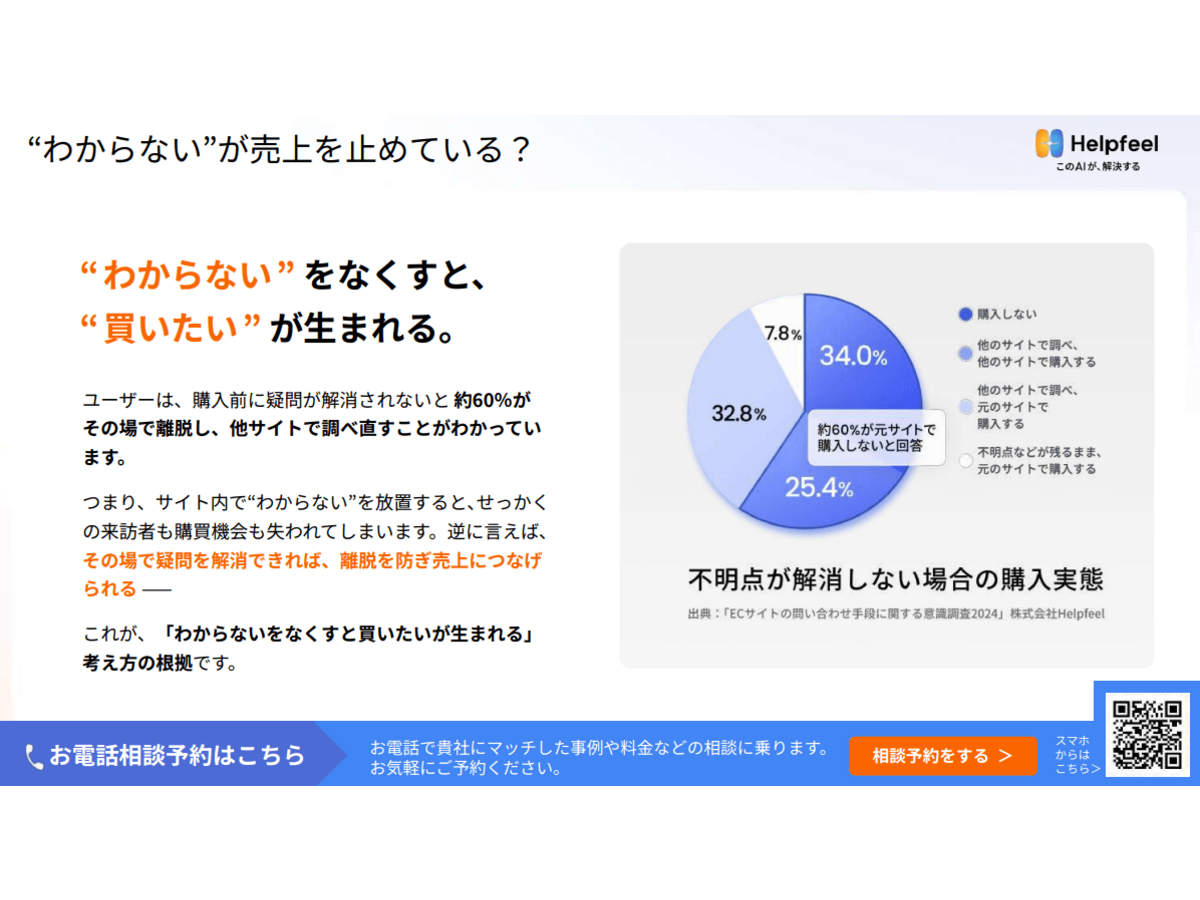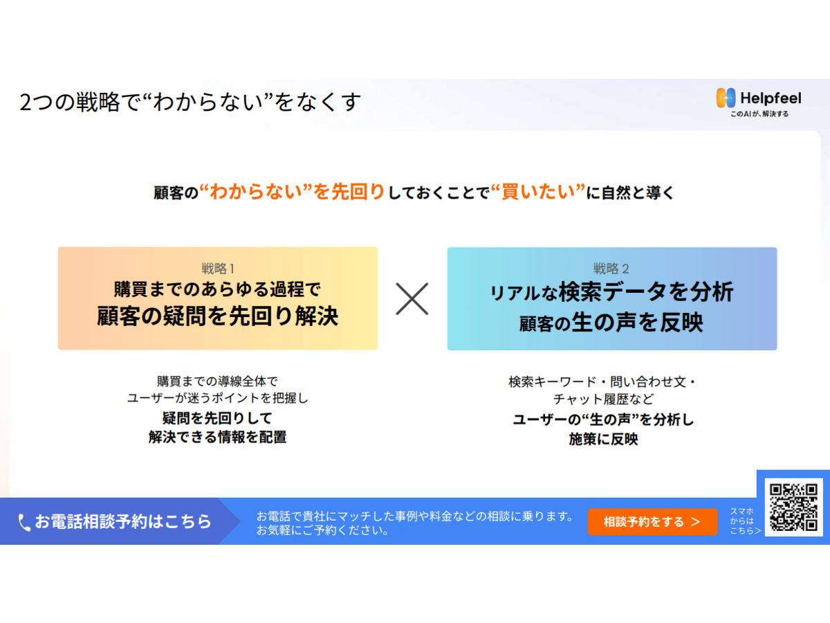 サービス利用や購入までの検討期間が⻑い商品やサービスでは「手数料は?」「サイズ交換はできる?」「どうやって使う?」などの小さな“わからない”が離脱の引き金になります。本資料では、この“わからない”を解消し、顧客の“買いたい”を生み出す新しいマーケ ティング戦略をご紹介します。